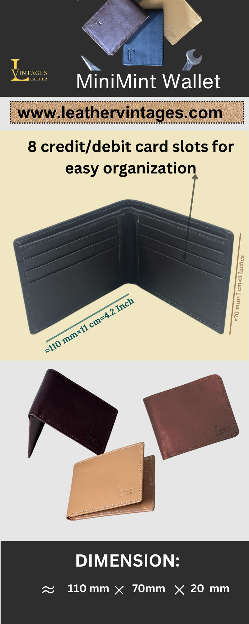 Introducing our sleek and versatile wallet designed for maximum functionality and style. With Eight dedicated credit/debit card slots,two full-length pockets for bills and receipts.This wallet has everything you need to stay organized and secure on the go. Crafted with precision and attention to detail, it’s the perfect blend of practicality and elegance, making it an essential accessory for your daily life.
